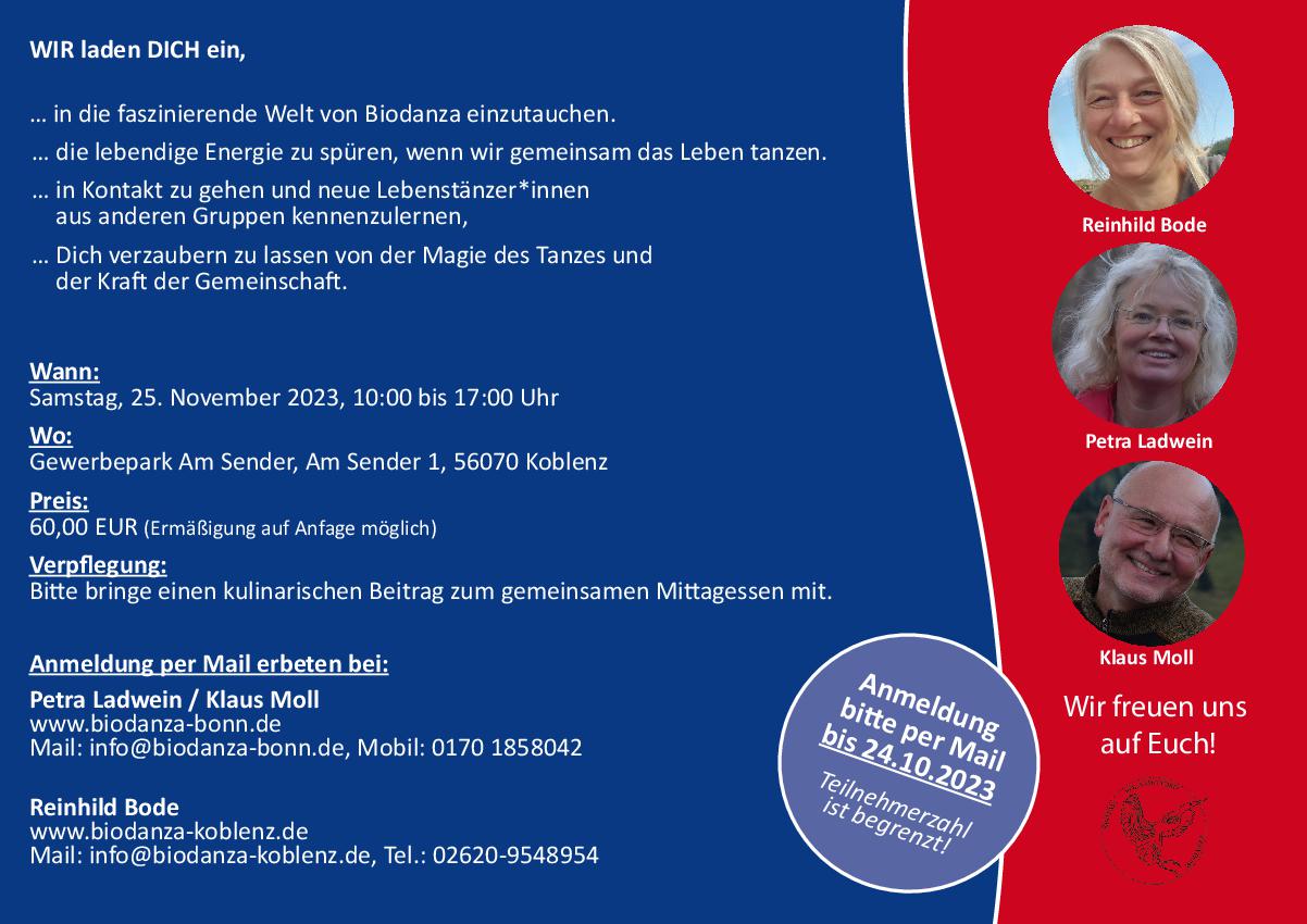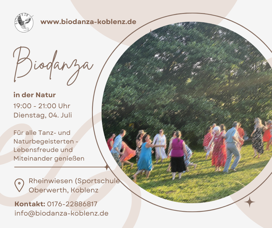 Anmeldung bis Sonntag, 02.07. unter Biodanza Koblenz (info@biodanza-koblenz.de).